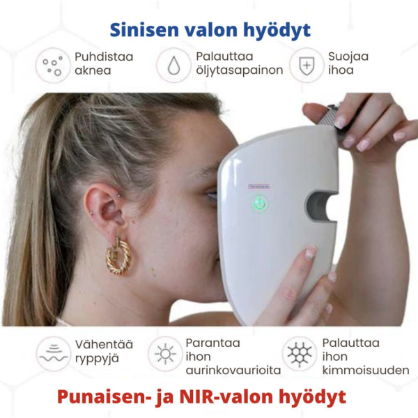 Glomask-valohoitomaski hoitaa kasvoja tehokkaasti sinivalon, punavalon sekä lähi-infrapunavalon (NIR) avulla auttaen saavuttamaan puhtaan, kuulaan ja nuorekkaan ihon. Glomask-valohoitomaski toimii luonnollisen ja kliinisesti tutkitun LED-valohoidon avulla. Laitetta on helppoa ja turvallista käyttää. Silkonisen silmäsuojuksen ansiosta silmäsi ovat erittäin hyvin suojattuna suoralta valolta.