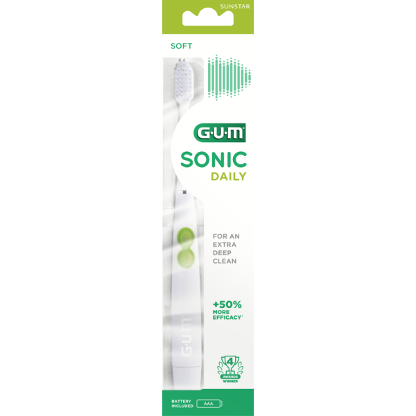 Paristokäyttöinen GUM® Sonic Daily paristohammasharja värisee puhdistaen hampaat hellästi ja stimuloiden ikeniä edistäen joka päivä suun terveyttä.