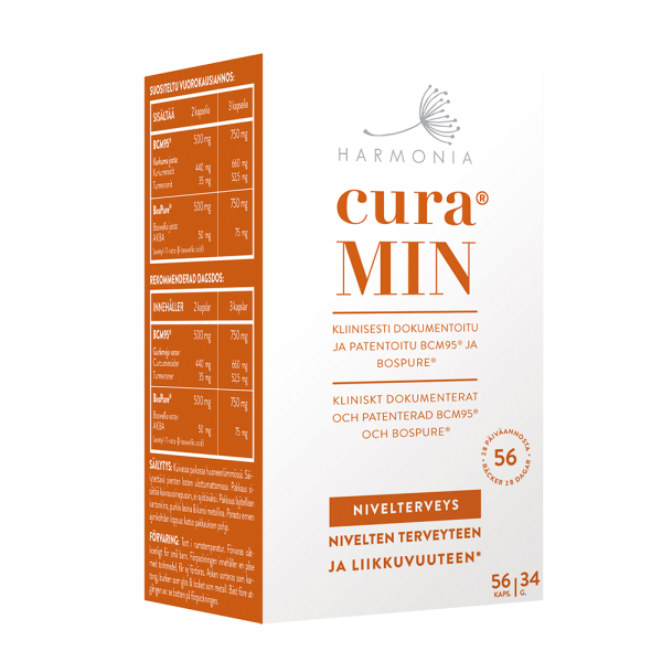 curaMIN® sisältää hyvin dokumentoitua BCM95®:n (kurkumiini + turmeronit) & BosPure®:n (boswellia) yhdistelmää, jotka myötävaikuttavat toisiinsa ja siten vahvistavat toistensa ominaisuuksia. Teho & turvallisuus on osoitettu useissa tutkimuksissa.