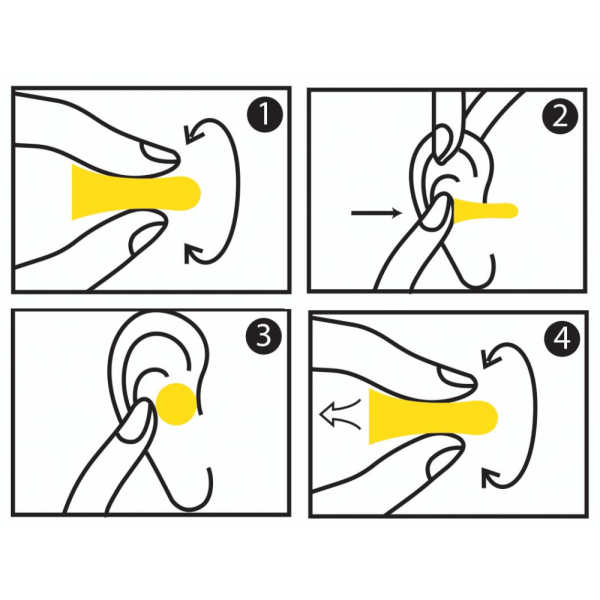 Ennen kuin asetat korvatulpat paikalleen, varmista, että ne ovat puhtaat. Vedä korvaasi vastakkaisella kädellä suoristaaksesi korvakäytävää. Tartu toisella kädellä puhtaasta korvatulpasta ja aseta se varovasti korvakäytävään. Älä laita korvatulppaa liian syvälle korvakäytävään, koska se aiheuttaa kipua. Aseta ja irrota korvatulpat aina varoen, jotta korvat eivät vaurioidu.
