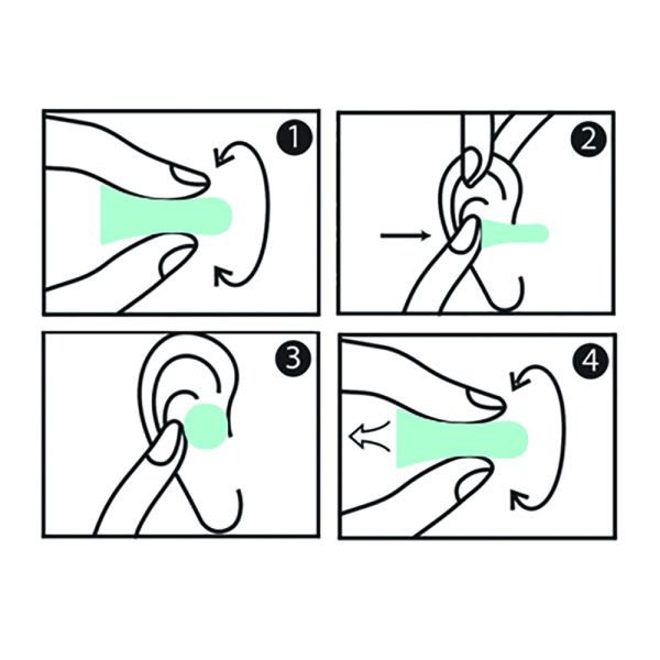 Ennen kuin asetat korvatulpat paikalleen, varmista, että ne ovat puhtaat. Vedä korvaasi vastakkaisella kädellä suoristaaksesi korvakäytävää. Tartu toisella kädellä puhtaasta korvatulpasta ja aseta se varovasti korvakäytävään. Älä laita korvatulppaa liian syvälle korvakäytävään, koska se aiheuttaa kipua. Aseta ja irrota korvatulpat aina varoen, jotta korvat eivät vaurioidu.