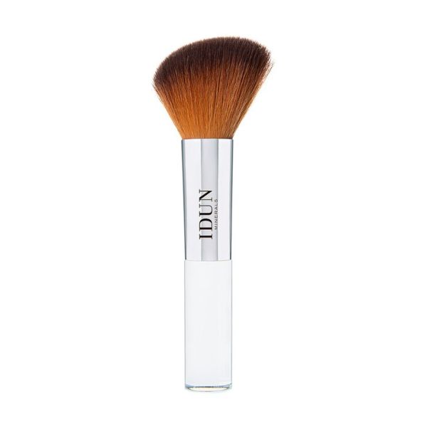 Poskipunasivellin poskipunan ja aurinkopuuterin levittämiseen. IDUN Minerals -poskipunasiveltimen viistopäinen rakenne mahdollistaa poskipäiden korostamisen ja kasvojen varjostamisen helposti. Siveltimellä saadaan levitettyä runsaspigmenttiset tuotteet tasaisesti. IDUN Minerals -siveltimet valmistetaan laadukkaasta, synteettisestä kuidusta, taklonista. Materiaali on luonnonkarvaa pehmeämpää, se ei allergisoi, eikä siitä irtoa harjaksia. Siveltimet eivät ärsytä herkkääkään ihoa ja sopivat myös acneen tai rosaceaan taipuvalle iholle. Sileä taklonkuitu ei myöskään kerää helposti bakteereja. Hypoallergeeninen. Vegaaninen.