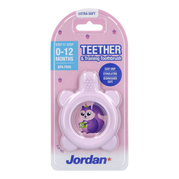 Jordan Step 0 Teether and Training toothbrush on harjoitushammasharja puhkeaville hampaille. Siinä on harjoitusharja harjamaisella päällä sekä pehmeä ja ergonominen pururengas. Turvallinen käyttää. Hygieeninen ja konepesun kestävä.