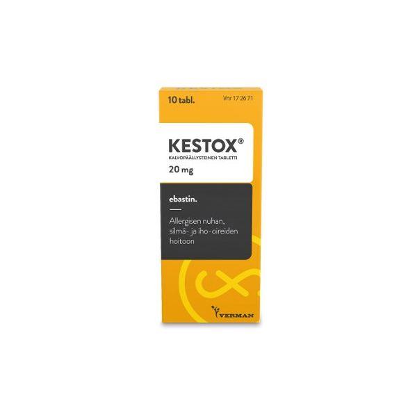 Kestoxin vaikuttava aine ebastiini on antihistamiini ja sitä käytetään allergisen nuhan vaikeiden oireiden helpottamiseen, mukaan lukien tapauksissa, joissa on lisäoireena allerginen silmän sidekalvotulehdus. Pitkäaikaiseen käyttöön vain lääkärin määräyksestä. Ei alle 12-vuotiaille lapsille.