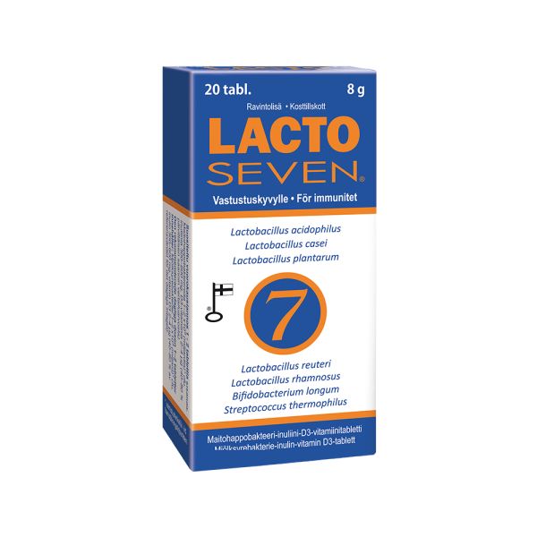 Lacto Seven sisältää seitsemää erilaista kylmäkuivattua, luonnollista maitohappobakteerikantaa. Valmisteeseen on valittu vain tutkittuja maitohappobakteerikantoja. Yhdessä tabletissa on yhteensä miljardi elävää maitohappobakteeria. Bakteereilla on erityinen Bio-Support™-suojaus, jonka ansiosta bakteerit säilyvät elävinä ja toimintakykyisinä aina suolistoon saakka. Lacto Seven sisältää myös inuliinikuitua ja D-vitamiinia, joka edistää vastustuskyvyn normaalia toimintaa.