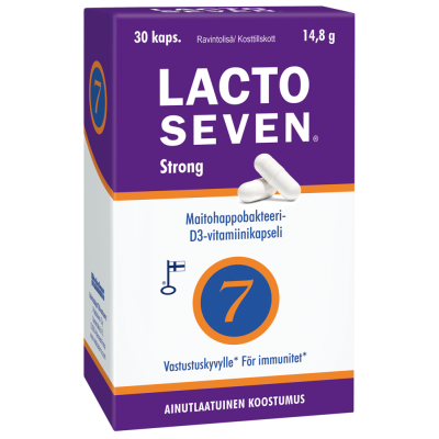 Lacto Seven sisältää seitsemän erilaista kylmäkuivattua, luonnollista maitohappobakteerikantaa. Valmisteeseen on valittu vain tutkittuja maitohappobakteerikantoja. Yhdessä kapselissa on yhteensä 10 miljardia elävää maitohappobakteeria. Bakteereilla on erityinen Bio-Support™-suojaus, jonka ansiosta bakteerit kestävät mahan happamuutta, ja ne säilyvät elävinä ja toimintakykyisinä aina suolistoon saakka. Lacto Seven Strong sisältää myös D-vitamiinia, joka edistää vastustuskyvyn normaalia toimintaa.
