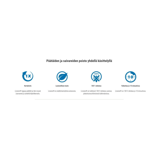 Licener-shampoota ei saa käyttää sellaiselle henkilölle, joka on allerginen jollekin valmisteen sisältämälle ainesosalle. Muiden shampoiden tapaan Licener® voi aiheuttaa lievää silmien ärsytystä. Pyri välttämään shampoon joutumista silmiin. Jos ainetta kuitenkin joutuu silmiin, huuhtele huolellisesti vedellä.
