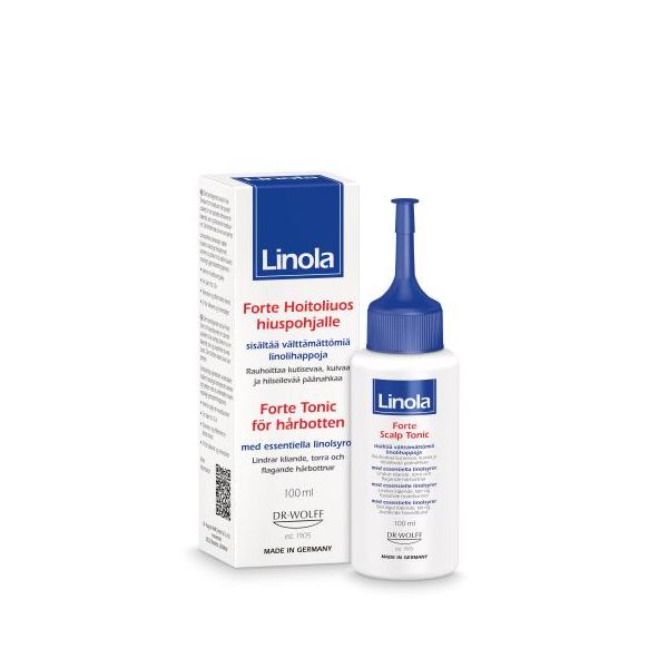 Linola Forte Hoitoliuos hiuspohjalle rauhoittaa ärtynyttä ihoa ja edistää ihon palautumista. Tuote sisältää runsaasti linolihappoa sisältäviä kasviöljyjä – rakennelipidien luonnollista rakennusainetta. Päänahan puristava tunne ja hiuspohjan hilseily vähenevät selvästi. Tuote ehkäisee hiuspohjan kuivumista ja lievittää kutinaa. Sen sisältämällä echinacea-juuriuutteella on myös rauhoittava vaikutus. Hoitoliuos on intensiivinen päänahan hoitoaine jatkuvaan kosteutukseen.