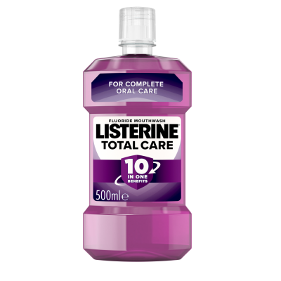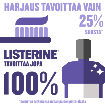 Hammaskiven ehkäisyyn - 6 etua yhdessä! LISTERINE® Total Care -suuvesi ehkäisee hammaskiveä, vähentää plakkia, suojaa ikeniä ja raikastaa hengityksen 12 tunniksi. Se sisältää hampaita vahvistavaa fluoria ja suojaa reikiintymiseltä. LISTERINE® Total Care ehkäisee hammaskiven muodostumista 21 % enemmän kuin pelkkä hampaiden harjaaminen. Käytä kahdesti päivässä hampaiden harjauksen jälkeen. Yli 12-vuotiaille. Saatavilla myös alkoholiton, miedomman makuinen vaihtoehto, LISTERINE® Total Care Milder Taste.