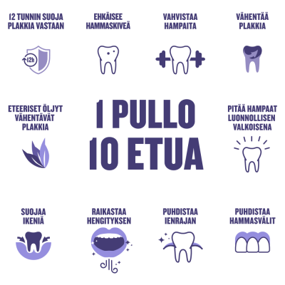 Hammaskiven ehkäisyyn - 6 etua yhdessä! LISTERINE® Total Care -suuvesi mm. ehkäisee hammaskiveä, vähentää plakkia, suojaa ikeniä ja raikastaa hengityksen 12 tunniksi. Sisältää hampaita vahvistavaa fluoria ja suojaa reikiintymiseltä.