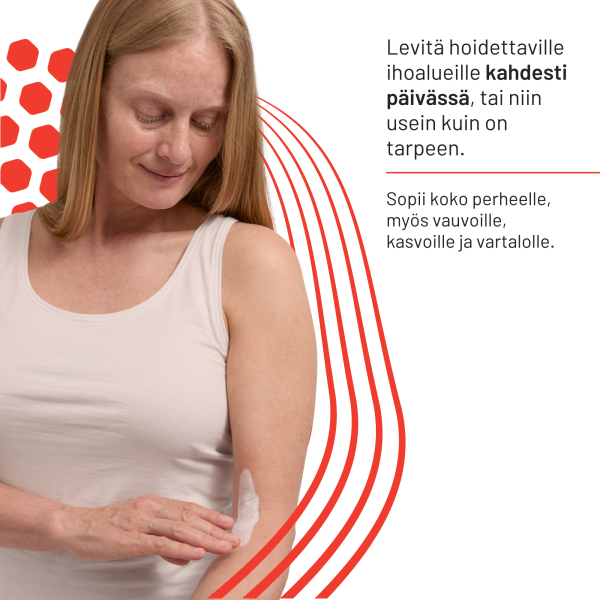 Aikuiset, lapset ja vauvat: Levitä ihottuma-alueelle kahdesti päivässä, mieluiten aamulla ja illalla suihkun jälkeen, kun iho on puhdas ja kuiva.