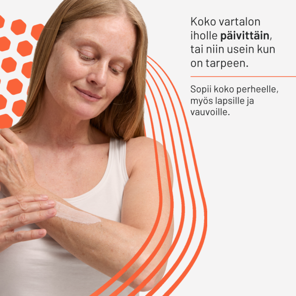 Levitä koko kehon kuiville ihoalueille kerran päivässä tai niin usein, kun on tarpeen. Sopii kasvoille ja vartalolle, koko perheelle, myös lapsille ja vauvoille.
