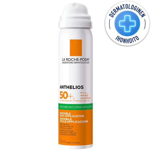 ANTHELIOS Anti Shine Mist SPF50+ on erittäin korkea ja laajakirjoinen suoja herkälle iholle, myös rasvoittuvalle tai epäpuhtauksiin taipuvaiselle iholle. Kevyt ja raikas suihke, joka antaa välittömästi raikkaan tunteen. Spraysuihketta on helppo käyttää päivän aikana eikä se tahmaa.