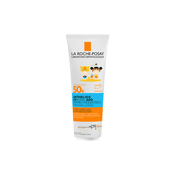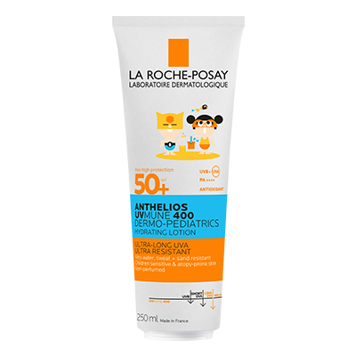 ANTHELIOS UVMUNE 400 LASTEN AURINKOSUOJAVOIDE SPF50+. Erittäin korkea aurinkosuoja sisältäen suojan ultrapitkiä UVA-säteitä* vastaan kasvoille ja vartalolle.