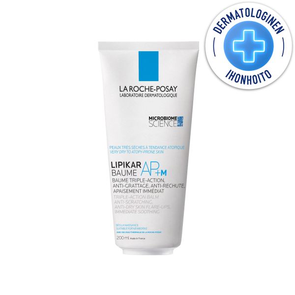 LIPIKAR BAUM AP+ M: Rauhoittava, vahvistava ja kutinaa hillitsevä vartalovoide. Vähentää kuivuuden aiheuttamaa kutinaa ja sen uusiutumista. Sopii herkälle ja kuivuudesta ärtyneelle iholle sekä atopiaan taipuvaiselle iholle. Hajusteeton