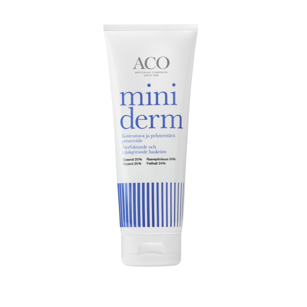 Miniderm on hellävarainen perusvoide, joka pehmentää, hoitaa ja kosteuttaa kuivaa ihoa. Sisältää 20 % glyserolia, joka sitoo kosteutta tehokkaasti ihoon. Miellyttävä käyttää, levittyy helposti ja imeytyy nopeasti. Hajusteeton.