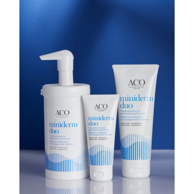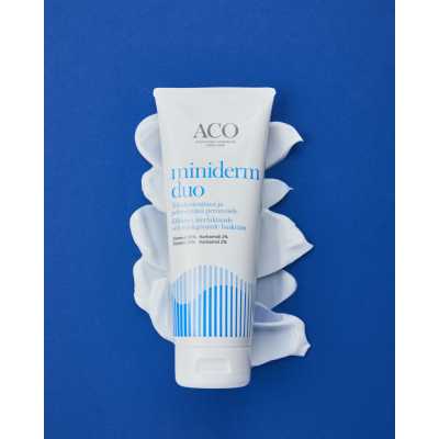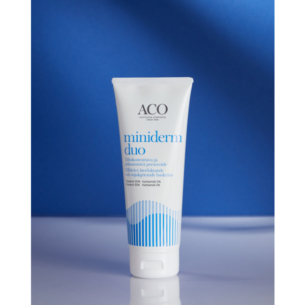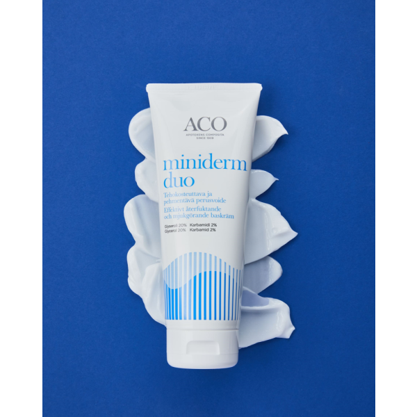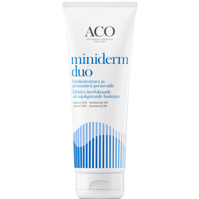 Miniderm Duo on hellävarainen ja tehokosteuttava perusvoide, joka vahvistaa, suojaa ja rauhoittaa kuivaa ihoa. Sisältää yhdistelmän 20% glyserolia ja2% karbamidia, jotka sitovat tehokkaasti kosteutta ihoon ja vahvistavat ihon läpäisyestettä. Helpottaa ihon kuivuutta ja kutinaa. Miellyttävä käyttää, levittyy helposti ja imeytyy nopeasti. Hajusteeton. -Kaikille ihotyypeille, erityisesti kuivalleja atooppiselle iholle -Sopii kaikenikäisille: vauvoille, lapsille ja aikuisille