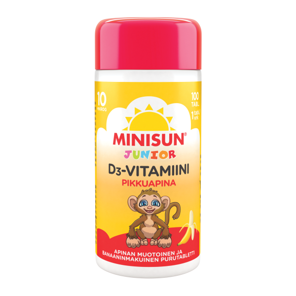 Minisun Junior Apina on helppo tapa turvata lapsen päivittäinen D-vitamiinin saanti. Minisun Junior Apina on maukkaan banaanin makuinen ja apinan muotoinen tabletti, joka on helppo pureskella, imeskellä tai niellä. Hyvänmakuiset purutabletit sisältävät 10 mikrogrammaa tehokkaasti imeytyvää D3-vitamiinia. D-vitamiini on tarpeellinen lasten luuston ja hampaiden pysymiselle normaaleina. Lisäksi D-vitamiini edistää immuunijärjestelmän normaalia toimintaa lapsilla. Valmisteessa ei ole lisättyjä väriaineita eikä sokeria. Se ei sisällä gluteenipitoisen viljan ainesosia. Minisun D-vitamiini Junior on lisäksi maidoton, laktoositon, liivatteeton ja hiivaton.