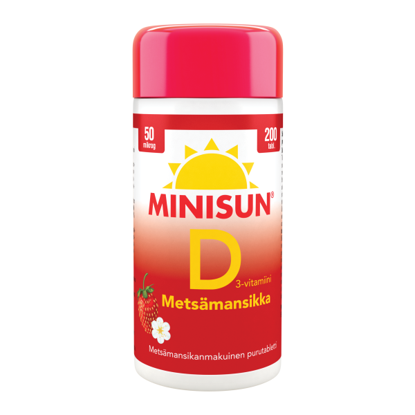 Suomessa kehitetyt Minisun D-vitamiinitabletit ovat helppo tapa varmistaa riittävä D-vitamiinin saanti ympäri vuoden. Minisun 50 mikrog Metsämansikka sisältää tehokkaasti imeytyvää D3-vitamiinia. D-vitamiini vahvistaa vastustuskykyä sekä on tärkeä vitamiini luuston, lihasten ja hampaiden hyvinvoinnille. Annostelu on helppoa. Yksi pieni purutabletti päivässä riittää. Minisun 50 mikrog Metsämansikka on raikkaan kesäisen makuinen ja se sopii nuorille, aikuisille ja ikääntyville tehostettuun päivittäiseen käyttöön. Minisun Metsämansikka on helppo pureskella, imeskellä tai niellä. Laktoositon, gluteeniton, hiivaton, soijaton ja liivatteeton.