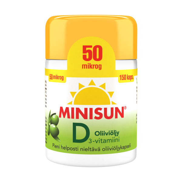 Minisun D-vitamiini oliiviöljykapselit ovat helppo tapa varmistaa riittävä D-vitamiinin saanti. Yksi oliiviöljykapseli sisältää 50 mikrogrammaa tehokkaasti imeytyvää D3-vitamiinia korkealaatuisessa extra-neitsytoliiviöljyssä ja sopii nuorille, aikuisille ja ikääntyville tehostettuun päivittäiseen käyttöön. Pienikokoinen Minisun Oliiviöljykapseli on helppo niellä. Ei sisällä gluteenipitoisen viljan ainesosia. Laktoositon, hiivaton, soijaton.