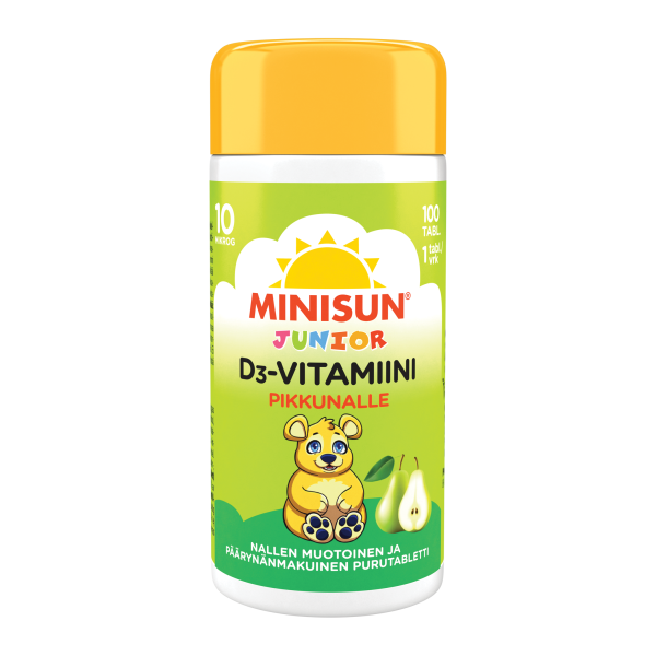 Minisun Junior Nalle on helppo tapa turvata lapsen päivittäinen D-vitamiinin saanti. Minisun Junior Nalle on maukkaan päärynän makuinen ja nallen muotoinen tabletti, joka on helppo pureskella tai imeskellä. Hyvänmakuiset purutabletit sisältävät 10 mikrogrammaa tehokkaasti imeytyvää D3-vitamiinia. D-vitamiini on tarpeellinen lasten luuston ja hampaiden pysymiselle normaaleina. Lisäksi D-vitamiini edistää immuunijärjestelmän normaalia toimintaa lapsilla. Valmisteessa ei ole lisättyjä väriaineita. Minisun D-vitamiini Junior on lisäksi gluteeniton, laktoositon, maidoton ja soijaton.