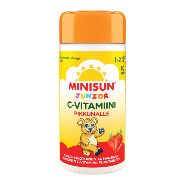 Minisun Super Nalle C-vitamiini on lasten makuun sopiva nallenmuotoinen ja mansikan makuinen purutabletti. Yksi tabletti sisältää 150 mg C-vitamiinia. Nallenmuotoinen purutabletti on helppo pureskella, imeskellä tai niellä. Vain luontaisia makeutusaineita, aromeja ja väriaineita. Tuote ei sisällä gluteenipitoisen viljan ainesosia tai eläinperäisiä ainesosia ja lisäksi se on maidoton, laktoositon, soijaton, liivatteeton ja hiivaton.