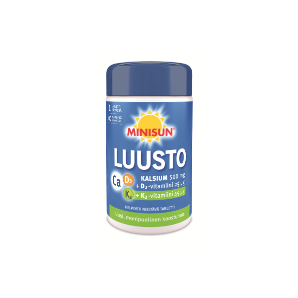 Minisun Kalsium +D₃ + K₂ sisältää kalsiumia sekä D₃- ja K₂-vitamiinia. Minisun Kalsium +D₃ + K₂-vitamiini on enemmän kuin kalsium: se sisältää luuston hyvinvoinnin kannalta kaksi elintärkeää vitamiinia sekä kivennäisaineen yhdessä tabletissa. Jokaisella ainesosalla on oma roolinsa luuston terveyden ylläpidossa. D-vitamiini, kalsium ja K₂-vitamiini varmistavat yhdessä luuston hyvinvoinnin. K₂-vitamiini sitoo kalsiumin elimistössä oikeaan paikkaan eli luustoon. Lisäksi D-vitamiini vahvistaa vastustuskykyä ja on tärkeä vitamiini lihasten ja hampaiden hyvinvointiin. Yksi nieltävä tabletti päivässä riittää! Valmiste ei sisällä ei sisällä gluteenipitoisen viljan ainesosia, ja on lisäksi laktoositon, maidoton, liivatteeton, soijaton sekä hiivaton.