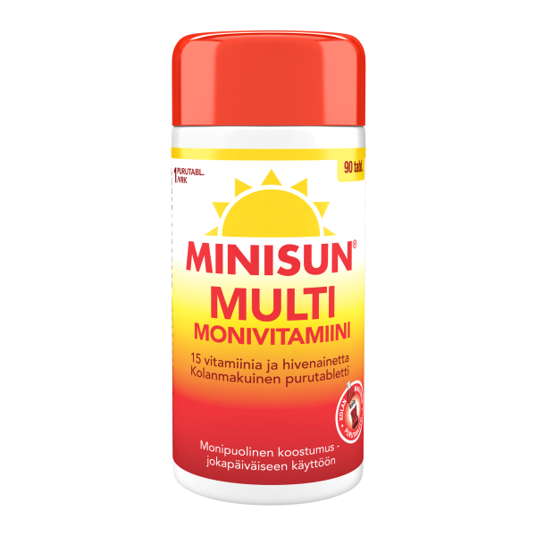 Makeutusaineet (sorbitoli, ksylitoli, sukraloosi); vitamiinit (C, E, niasiini, pantoteenihappo, B6, riboflaviini, tiamiini, foolihappo, biotiini, D3, B12); stabilointiaineet (rasvahappojen mono- ja diglyseridit); täyteaineet (dikalsiumfosfaatti, mannitoli, hydroksipropyyli- ja mikrokiteinen selluloosa); paakkuuntumisenestoaineet (rasvahappojen magnesiumsuolat, piidioksidi), happo (sitruunahappo); kivennäisaineet (sinkki, mangaani, jodi, seleeni); maltodekstriini; muunnettu tärkkelys (maissista); kola-aromi