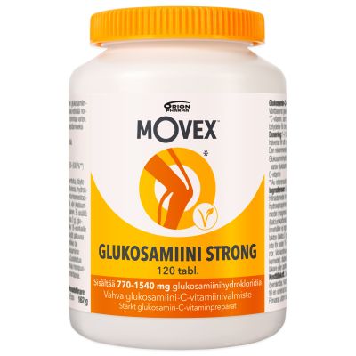 Movex Glukosamiini Strong on vahva ja täysin kasvipohjainen (fermentoitu) glukosamiini-C-vitamiinivalmiste nivelten hyvinvointiin*. Vegaaneille sopiva Avainlippu-tuote.
