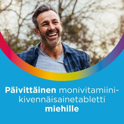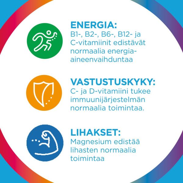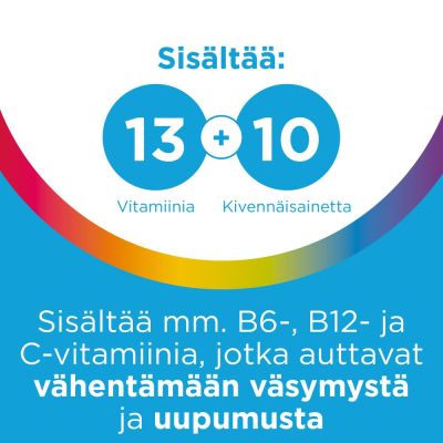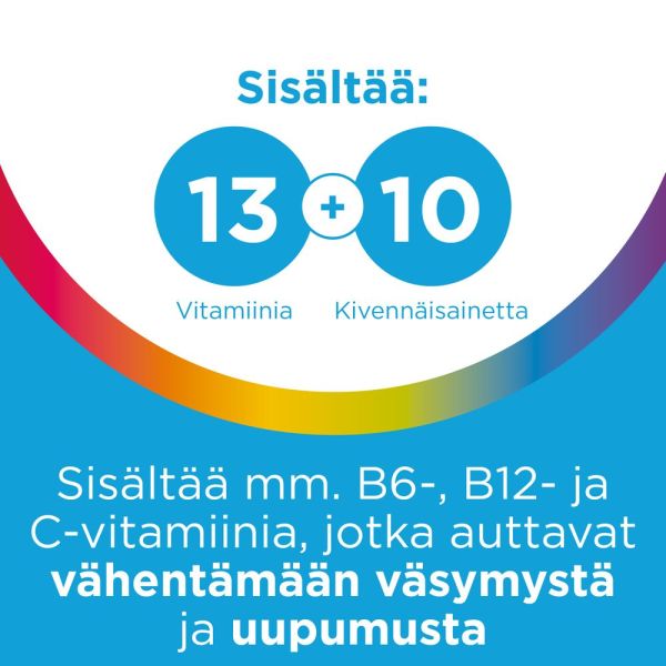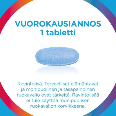 Ainesosat: Dikalsiumfosfaatti, magnesiumoksidi, kalsiumkarbonaatti, täyteaineet (mikrokiteinen selluloosa, hydroksipropyylimetyyliselluloosa, polydekstroosi), L-askorbiinihappo, paakkuuntumisenestoaineet (silloitettu natriumkarboksimetyyliselluloosa, magnesiumstearaatti, piidioksidi, talkki), DL-alfa-tokoferyyliasetaatti, nikotiiniamidi, ferrofumaraatti, kalsium-D-pantotenaatti, sinkkioksidi, pyridoksiinihydrokloridi, tiamiinimononitraatti, riboflaviini, beta-karoteeni, kasviöljyt (kookos, palmunydin), kuparisulfaatti, retinyyliasetaatti, pteroyylimonoglutamiinihappo, kromikloridi, natriummolybdaatti, kaliumjodidi, natriumselenaatti, D-biotiini, fyllokinoni, kolekalsiferoli, syanokobalamiini, värit (indigokarmiini).