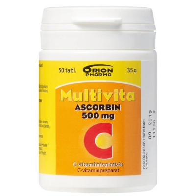 Multivita Ascorbin on nieltävä C-vitamiinitabletti, joka sisältää 500mg C-vitamiinia. Ei sisällä sokeria, laktoosia (tai maidon aineosia), gluteenia tai hiivaa. Tuotteet sopivat myös vegaaneille, sillä ne eivät sisällä eläinperäisiä aineosia. Multivita Ascorbinin sisältämä C-vitamiini edistää immuunijärjestelmän normaalia toimintaa, vähentää väsymystä sekä uupumusta ja edistää normaalia energia-aineenvaihduntaa. Ravintolisä.