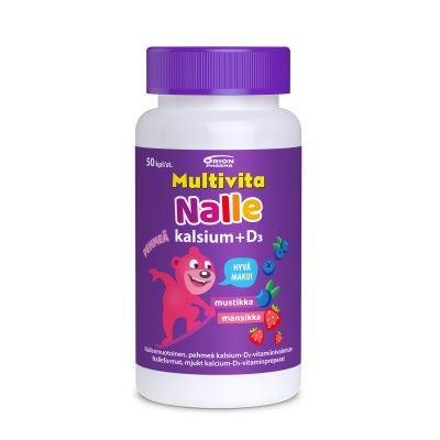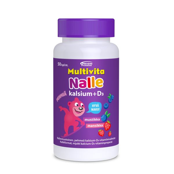 Multivita Nalle Kalsium+D3 on pehmeä ja pureskeltava, nallenmuotoinen kalsium -ja D3-valmiste, jossa kalsium on hyvänmakuisessa, helposti nautittavassa ja hauskassa muodossa. Yksi marjaisan makuinen nalle sisältää 100 mg kalsiumia ja 5 mikrog. D3-vitamiinia. Kalsium ja D3-vitamiini tukevat lapsen luuston normaalia kasvua ja kehitystä sekä vahvistavat vastustuskykyä*. Samassa pakkauksessa on sekä mansikan että mustikan makuisia nallevalmisteita, joista lapsi voi päivittäin valita mieleisensä maut. Valmisteet sisältävät vain luontaisia väri -ja aromiaineita.