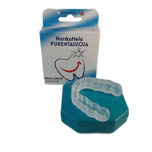 Hampaiden narskuttelu voi aiheuttaa kipua ja hampaiden kulumista. Purentasuoja sovitusuralla 2kpl -pakkaus sisältää kaksi valmiiksi esimuotoiltua purentasuojaa, joiden avulla voit helposti muotoilla suojan oman hammasprofiilisi mukaan. Purentasuojat ovat erinomainen ratkaisu lyhytaikaiseen hoitoon ja suojaavat hampaitasi yhteen purennalta sekä pitävät leuat rennompana. Yksinkertainen lämpömuotoilu kuuman veden avulla takaa hyvän istuvuuden. Pakkaukseen sisältyvät selkeät sovitusohjeet kuvien kera, käyttöohje, kaksi purentasuojaa sekä säilytyskotelo. Käytä vain yhtä purentasuojaa kerrallaan ja vaihda suojat 3-6 kuukauden välein tai kun purentasuoja hajoaa murenemalla tai paloina.