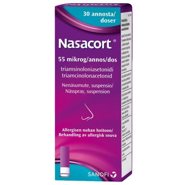 Nasacort-nenäsumutetta käytetään allergisen nuhan nenäoireiden hoitoon. Allergisia nenäoireita ovat mm. aivastelu, kutina ja tukkoinen tai vuotava nenä. Eri siitepölyt voivat aiheuttaa eri vuodenaikoina allergista nuhaa, jota kutsutaan kausiluonteiseksi allergiseksi nuhaksi. Nasacort-nenäsumutetta tulisi käyttää säännöllisesti, ja se ei välttämättä helpota allergiaoireitasi heti. Joillakin potilailla vaikutus alkaa ensimmäisenä hoitopäivänä, mutta toisilla allergiaoireiden helpottumiseen voi mennä 3–4 päivää. Nasacort-nenäsumutteen sisältämä vaikuttava aine on triamsinoloniasetonidi, joka on kortikosteroidien ryhmään kuuluva lääkeaine. Nasacort-nenäsumute on tarkoitettu yli 18-vuotiaille. Itsehoidossa Nasacort-nenäsumutetta ei tulisi käyttää yli 3 kuukauden ajan keskustelematta lääkärin kanssa.