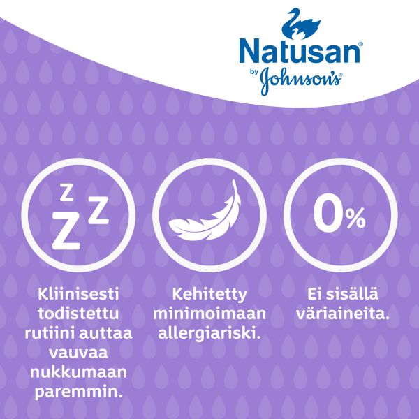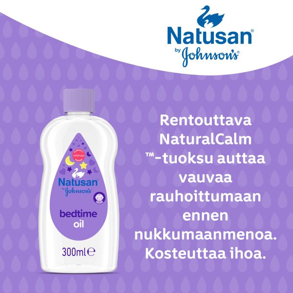 Anna lapsellesi ihana iltakylpy Bedtime Bath -kylpysaippuallamme osana iltarutiinia. Hiero pieni määrä Bedtime-pesunestettä lapsen iholle hellävaraisin liikkein ja huuhtele huolellisesti. Hiero sitten ihoa hellävaraisesti Bedtime Oil -hoitoöljyllä. Säännöllinen nukkumaanmenorutiini voi auttaa lasta nukahtamaan nopeammin ja nukkumaan pidempään.