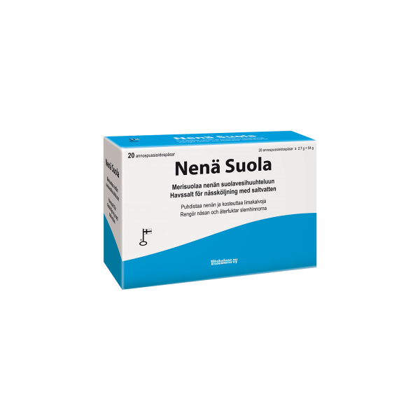Nenä Suola on tarkoitettu nenäkannussa käytettävän suolaliuoksen valmistamiseen. Annospussin avulla on helppo valmistaa suolavesihuuhteluun suositeltu 0,9 % suolaliuos. Nenän suolavesihuuhtelu puhdistaa nenän ja kosteuttaa limakalvoja.