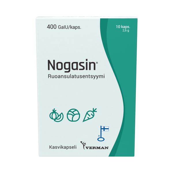 Nogasin on tehokas ja helppokäyttöinen entsyymivalmiste etenkin kasvikunnan tuotteiden kanssa käytettäväksi. Nogasin sisältää luontaista alfagalaktosidaasi–entsyymiä. Se on kätevä ja helppo käyttää niin arkena kuin juhlissakin. Nogasin toimii pilkkomalla ravinnon sulamattomia osia ruuansulatuskanavassa ja siten estää kaasunmuodostusta. Se auttaa pilkkomaan pitkäketjuisia hiilihydraatteja, joita esiintyy kasviksissa, kuten kaaleissa ja pavuissa, kokojyväviljassa ja pähkinöissä. Nogasin toimii jo ennen kuin ikäviä oireita on syntynyt. Siksi se tulee ottaa aterian yhteydessä.