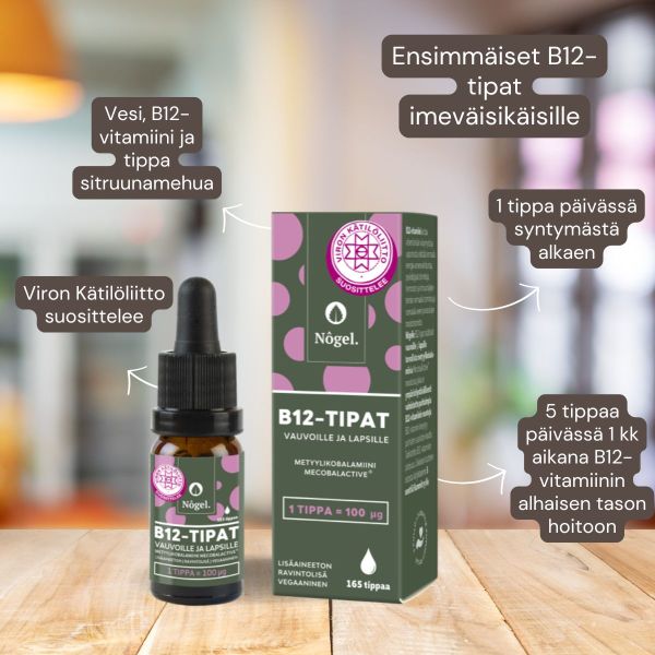Nôgelin B12-tipat sisältävät metyylikobalamiinia patentoidun MecobalActive® muodossa, joka on ympäristöystävällisesti valmistettu puhtaimpia B12-vitamiinin muotoja. B12-vitamiinin annoksesta imeytyy aktiivisesti 2 µg ja lisäksi passiivisesti 1%. Vain 3 ainesosaa, ilman lisäaineita. Jokaisen tuotteen ostosta lahjoitamme Kummit ry:lle 5 senttiä. Tarkistettu B12 pitoisuus jokaisen erän jälkeen.
