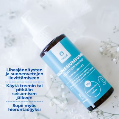 Nôgelin magnesiumsuihke sisältää tunnettua Zechstein Inside puhdasta magnesiumkloridia, joka on peräisin muinaisesta Zechsteinin merestä. Zechsteinin magnesiumkloridia pidetään maailman puhtaimpana luonnollisen magnesiumin lähteenä. Magnesiumin käyttö ihon kautta sopii hyvin lihasjännitysten ja suonenvetojen lievittämiseen ja treenin jälkeisen käyttöön haluamillasi lihasalueilla. Tuote on hajusteeton. Sopii vegaaneille. Jokaisen tuotteen ostosta lahjoitamme Kummit ry:lle 5 senttiä.