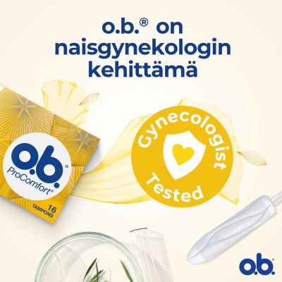 o.b.®-tamponit tarjoavat sinulle mukavaa ja luotettavaa suojaa, jonka ansiosta sinun ei tarvitse huolehtia kuukautisistasi. Tamponeja on eri kokoisia ja imukyvyltään erilaisia, jotta voit valita itsellesi parhaiten sopivan. o.b.® ProComfort™ on helppo asettaa paikoilleen ja poistaa ainutlaatuisen SilkTouch™-pinnan ansiosta. Se suojaa luotettavasti ainutlaatuisen kolmiulotteisesti laajenevan DynamicFit™-teknologian ansiosta, joka saa tamponin myötäilemään kehon muotoja ja auttaa nestettä imeytymään tehokkaasti koko tamponiin lomittaisten urien avulla. o.b.® ProComfort™ Mini sopii parhaiten tamponin käyttöön totutteleville tytöille sekä päiviin, jolloin vuoto on vähäistä tai kohtalaista. Tuote sisältää muovia. Älä huuhtele alas WC:stä. Heitä roskiin (sekajäte) käytön jälkeen ja auta suojelemaan ympäristöä.