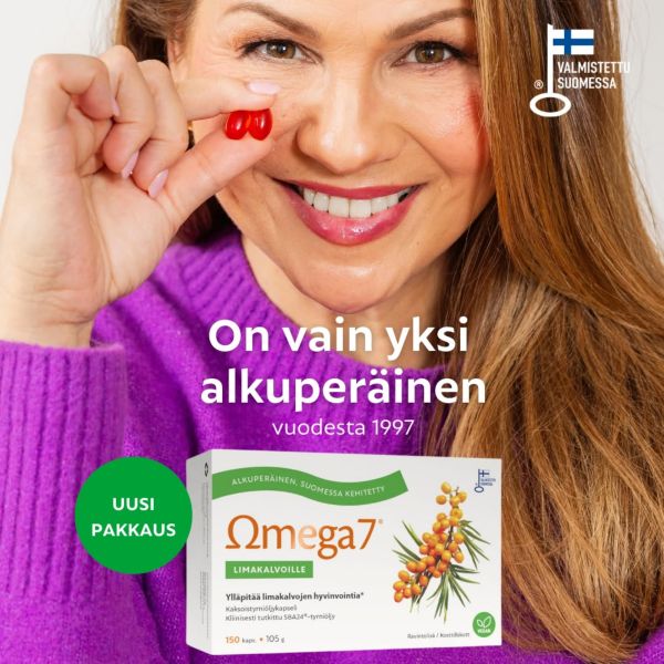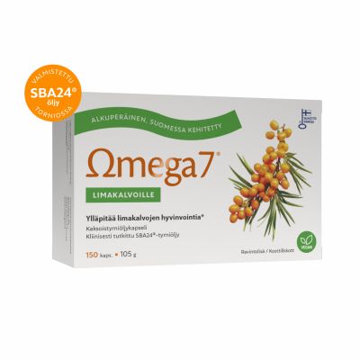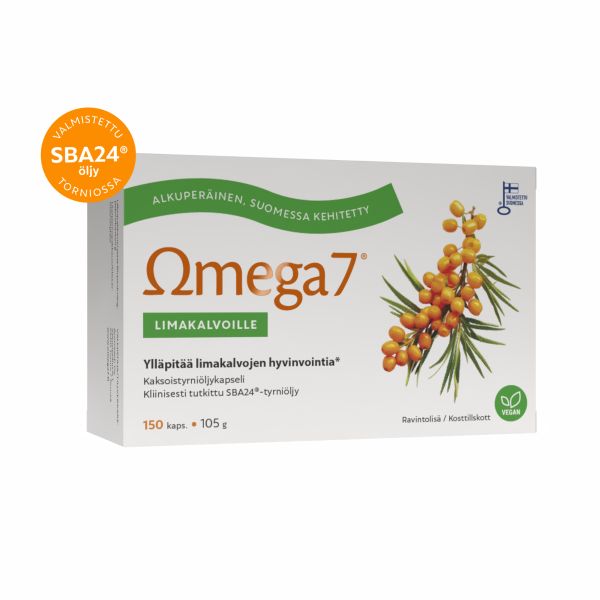 Alkuperäinen, Suomessa kliinisesti tutkittu Omega7 SBA24®-kaksoistyrniöljykapseli limakalvojen luonnolliseen kosteutukseen. Ainutlaatuinen SBA24®-kaksoistyrniöljy sisältää sekä tyrnin marja- että siemenöljyä. Näin saadaan limakalvoille ja iholle tärkeitä omega-3, -6, -7 ja -9 -rasvahappoja optimaalisessa suhteessa. SBA24®-tyrniöljyn riittävät ja vakioidut A- ja E-vitamiinitasot takaavat tuotteen toimivuuden. Kehomme valmistaa tyrniöljyn beetakaroteenista A-vitamiinia, joka ylläpitää limakalvojen ja ihon hyvinvointia. Suomessa kehitetyn ja valmistetun SBA24®-tyrniöljyn terveysvaikutuksia on tutkittu useissa tieteellisissä tutkimuksissa. Sopii suun ja intiimialueiden kuiville limakalvoille sekä kuivalle, ärtyneelle ja ikääntyvälle iholle. Tyypillisesti vaikutukset havaitaan 2-5 viikon säännöllisen käytön jälkeen. Avainlippu
