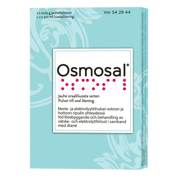 Sekoita yksi pussillinen (10,65 g) Osmosal-jauhetta 0,5 litraan haaleaa vettä.