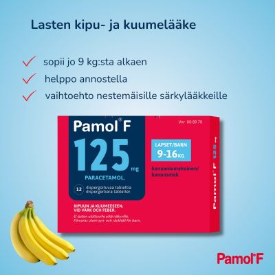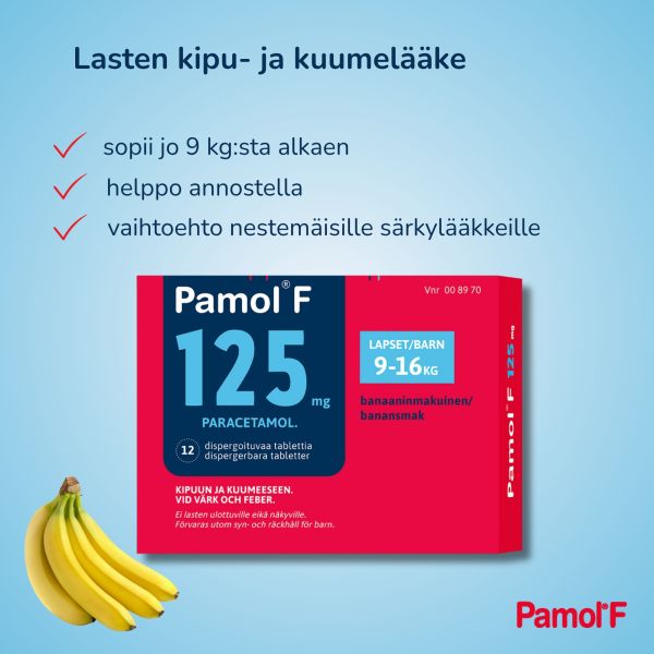Pamol F on nopeasti suussa liukeneva eli dispergoituva tabletti, jonka vaikuttavana aineena on parasetamoli. Sitä käytetään lasten kuumeen ja kivun hoitoon, kuten mm. hammassärkyyn, korvasärkyyn tai muihin särky- ja kiputiloihin, nuhakuumeen hoitoon ja rokotuksiin liittyvän kuumeiluun tai kipuun. Pamol F sopii erityisesti lapsille, jotka eivät osaa vielä niellä tabletteja tai otettavaksi silloin, kun nestettä ei ole saatavilla. Banaaninmakuinen tabletti liukenee nesteeseen nopeasti. Alle 9 kg painaville lapsille ja jatkuvaan käyttöön vain lääkärin ohjeen mukaan.