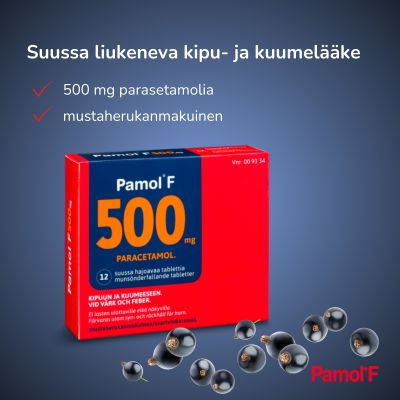 Pamol F on mustaherukanmakuinen kipu- ja kuumelääke suussa liukenevana tablettina. Lääke sisältää 500 mg parasetamolia. Se on tarkoitettu vain aikuisten käyttöön.