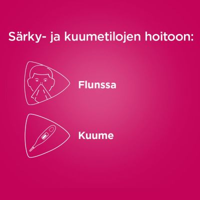 Kuume ja särkytilat vilustumissairauksien yhteydessä, influenssa, päänsärky ja lihassärky.