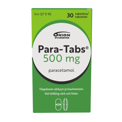 Para-Tabs 500 mg on kipulääke, joka alentaa myös kuumetta. Vaikuttavana aineena on parasetamoli, joka ei ärsytä ruoansulatuskanavaa ohjeen mukaisessa käytössä. Parasetamolia käytetään mm. lihas-, hammas- ja päänsärkyyn, kuukautiskipujen hoitoon sekä kuumeen ja kivun hoitoon virusten aiheuttaman nuhakuumeen ja influenssan yhteydessä. Pitkäaikaiseen käyttöön ja alle 4-vuotiaille lapsille vain lääkärin määräyksestä.