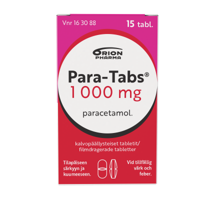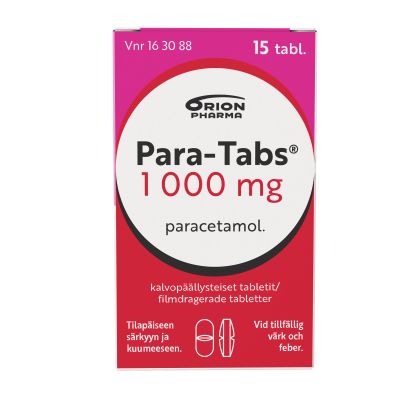 Para-Tabs 1 000 mg tabletit on kuumetta alentava kipulääke, jonka vaikuttava aine on parasetamoli. Sitä käytetään mm. tilapäisen lihassäryn, päänsäryn, kuukautiskipujen, hammassäryn ja nivelrikon sekä flunssan tai influenssan aiheuttaman kivun ja kuumeen hoitoon. Parasetamoli ei ärsytä ruoansulatuskanavaa ohjeen mukaisessa käytössä. Alle 16-vuotiaille ja pitkäaikaiseen käyttöön vain lääkärin ohjeen mukaan.