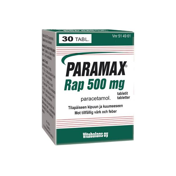 Paramax Rapin vaikuttava aine on parasetamoli, joka on hyvin siedetty kipulääke kuumeen ja kivun oireenmukaisessa hoidossa. Parasetamoli ei ärsytä ruoansulatuskanavaa, joten myös maha- ja pohjukaissuolihaavapotilaat voivat käyttää sitä. Alle 32-kiloisille ja jatkuvaan käyttöön vain lääkärin ohjeen mukaan. Alle 32-kiloisille lapsille on saatavilla Paramax Junior 250 mg tabletti.