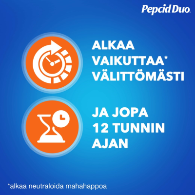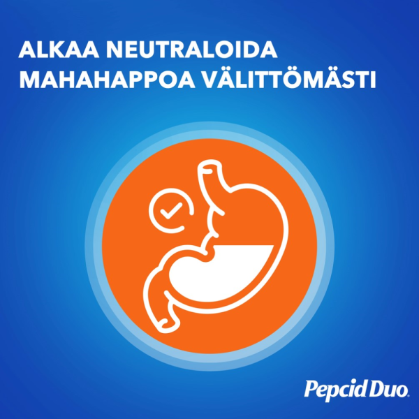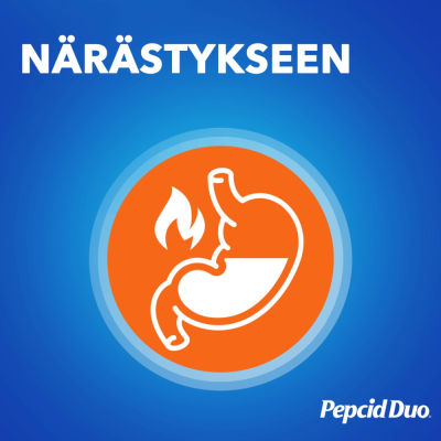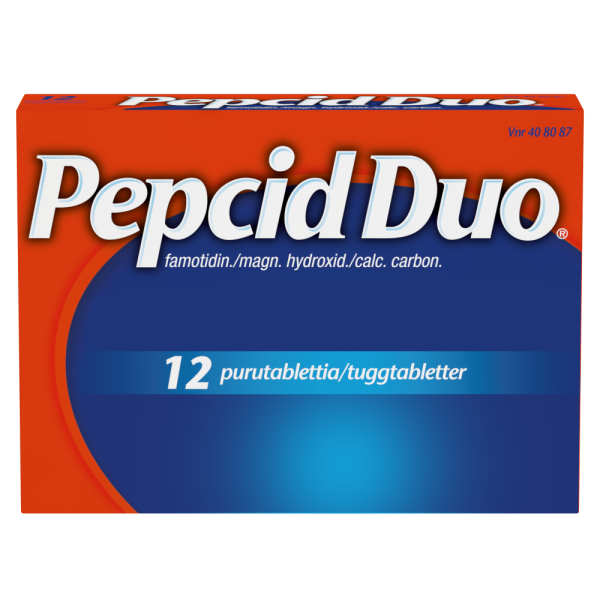 Pepcid Duo purutabletteja käytetään närästyksen ja happamien röyhtäisyjen oireiden lyhytaikaiseen hoitoon aikuisilla ja vähintään 16-vuotiaille. Pitkäaikaiseen käyttöön ja alle 16-vuotiaille vain lääkärin ohjeen mukaan.