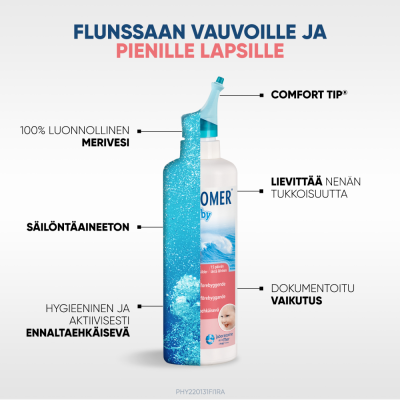 Physiomer Baby on vauvoille ja lapsille suunniteltu 100% luonnollista merivettä sisältävä nenähuuhde, joka lievittää vuotavan ja tukkoisen nenän oireita. Physiomer Baby helpottaa hengittämistä, mikä tekee nukkumisesta ja imettämisestä helpompaa ja miellyttävämpää. Nenähuuhdetta voi käyttää myös ennaltaehkäisemään riskiä jälkitaudeille korvissa, nenässä ja kurkussa, kuten korvatulehduksia. Suihkeen suutinosa on valmistettu pehmeästä ja hellävaraisesta materiaalista. Lisäksi suutin on suunniteltu niin, ettei sitä voi työntää liian syvälle vauvan nenään. Suuttimesta tuleva suihke on hellävarainen. Nenähuuhde ei sisällä säilöntäaineita ja sitä voi käyttää 15 päivän iästä alkaen. Käytetään tarvittaessa. Physiomer Baby on lääkinnällinen laite. Lue pakkausseloste huolellisesti ennen käyttöä.